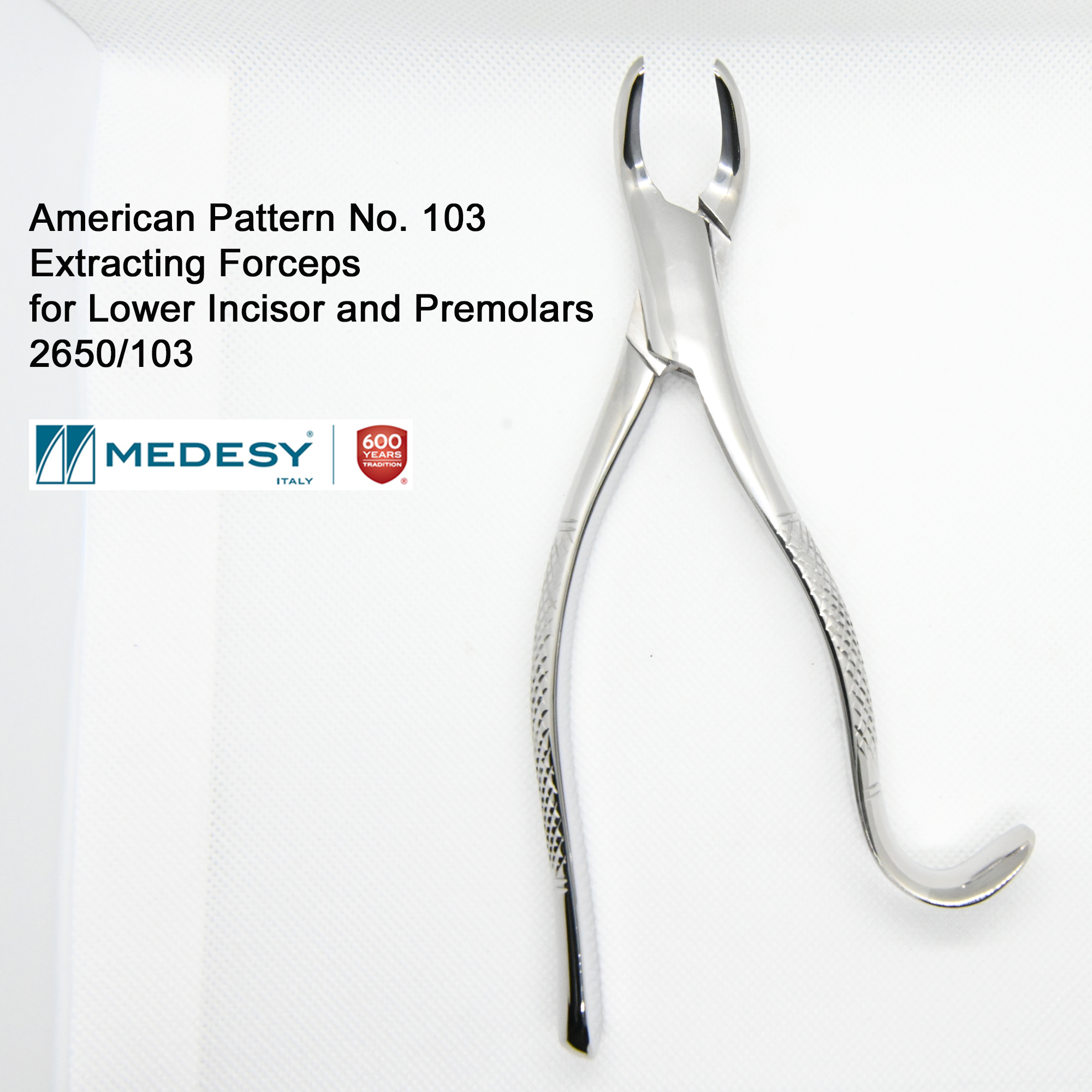 The Medesy 2650/103 is an American Pattern dental extraction forcep used for removing lower incisors, premolars, and roots from either side of the mouth.
