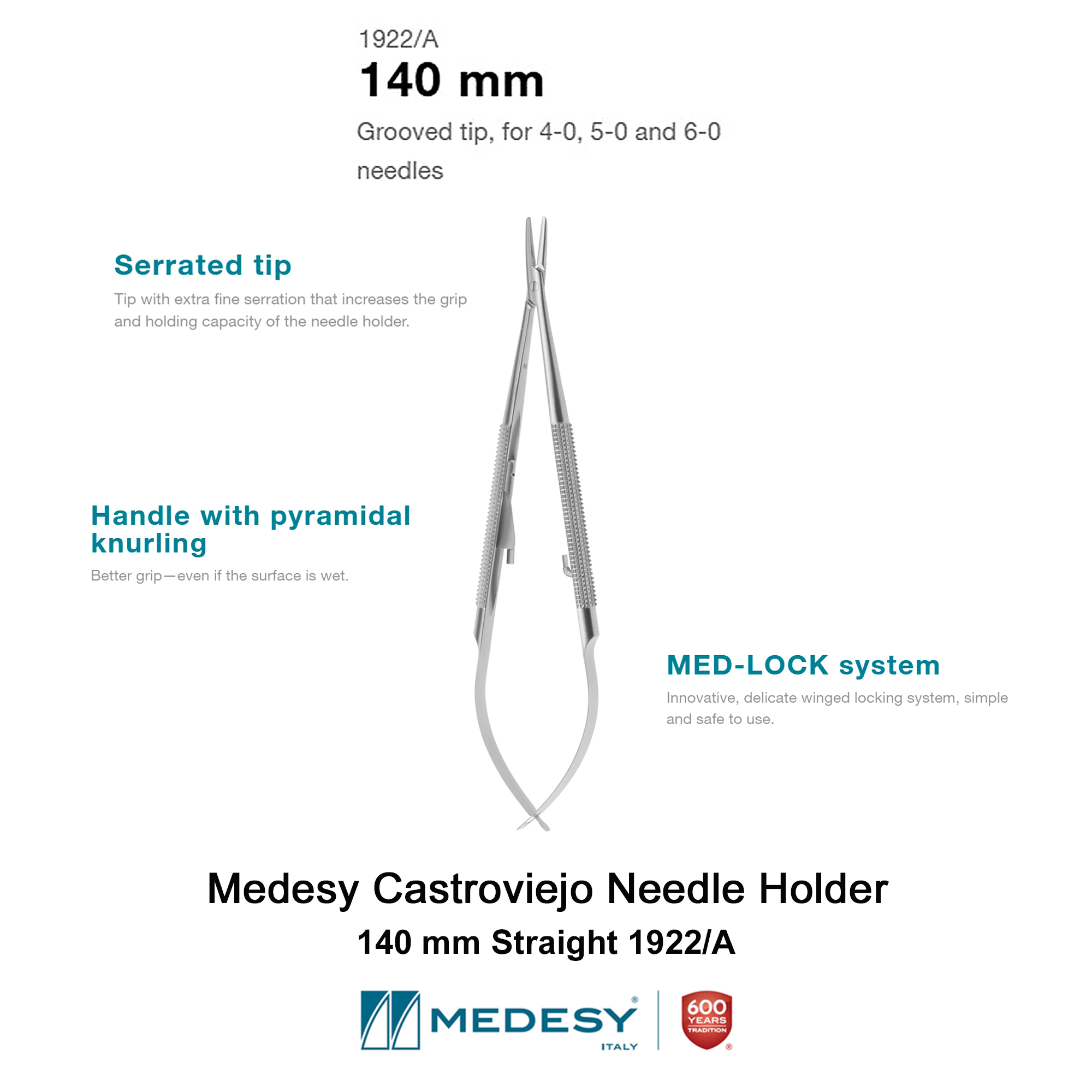 MEDESY’s CASTROVIEJO series of straight tip needle holders is among the most well-equipped. All models are suitable for use with 4-0, 5-0 and 6-0 needles. The handle design features a pyramidal knurling that provides a comfortable, secure grip—even on wet surfaces. It has a stainless-steel serrated tip, and the locking system is ensured by the MED-LOCK fastener: innovative in its simplicity and functional sensitivity.