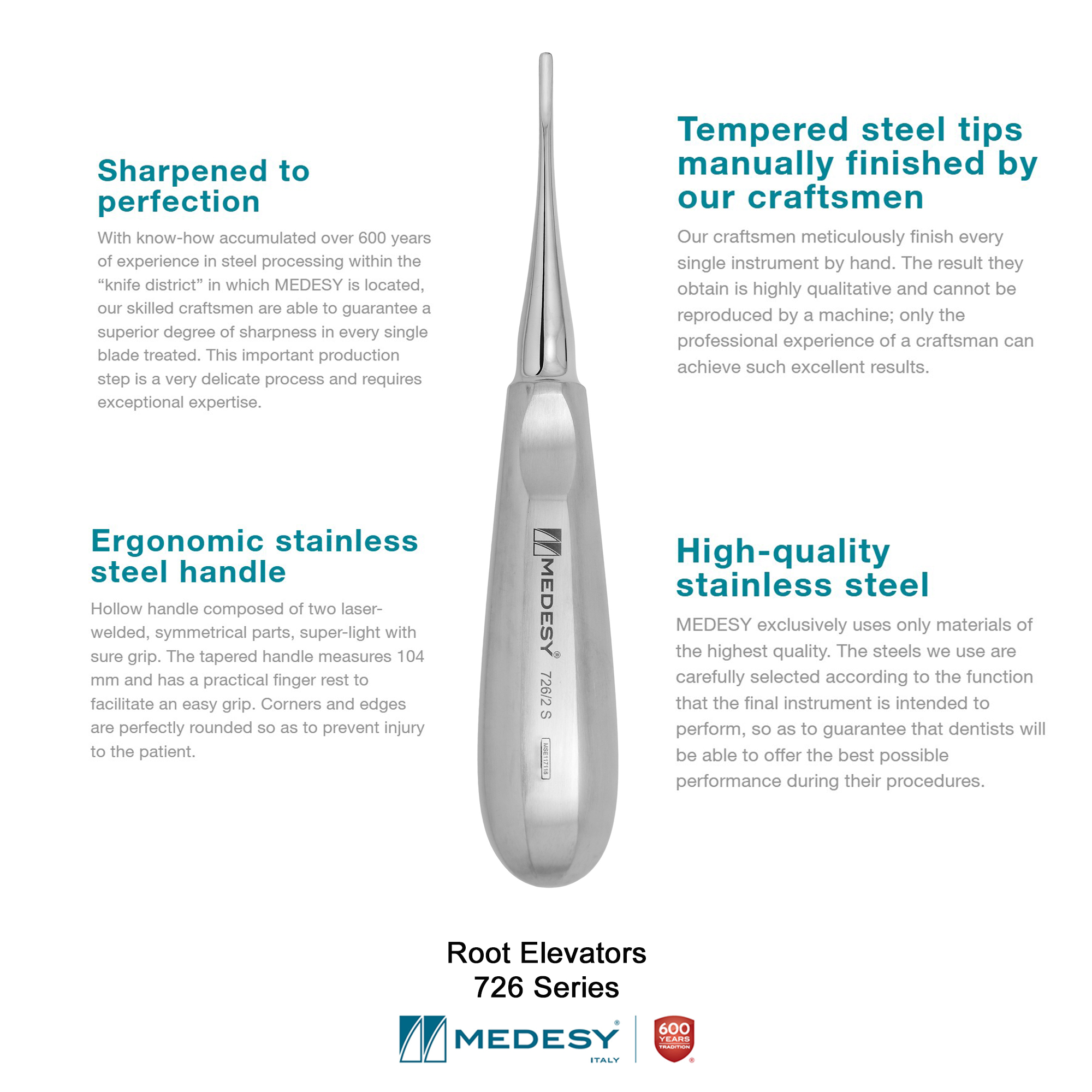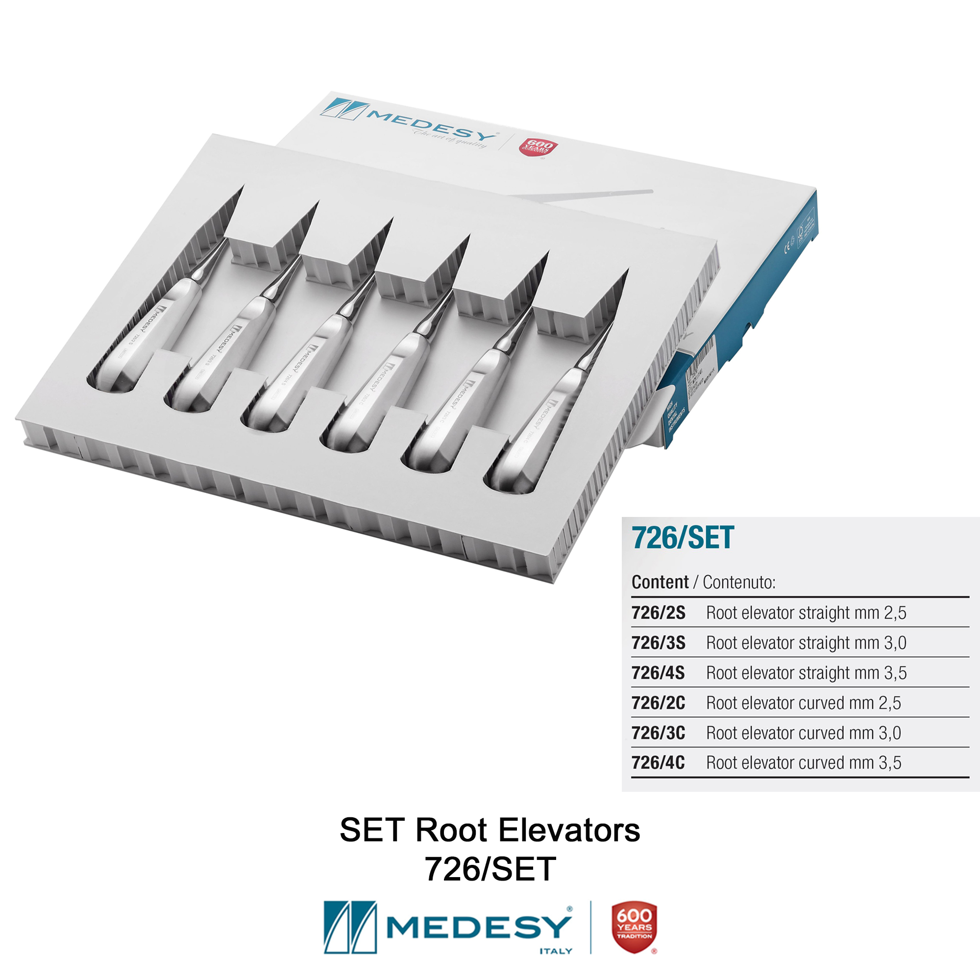 The Medesy SET Root Elevators 726 /SET is Medesy’ s premiere set of Root Elevators.