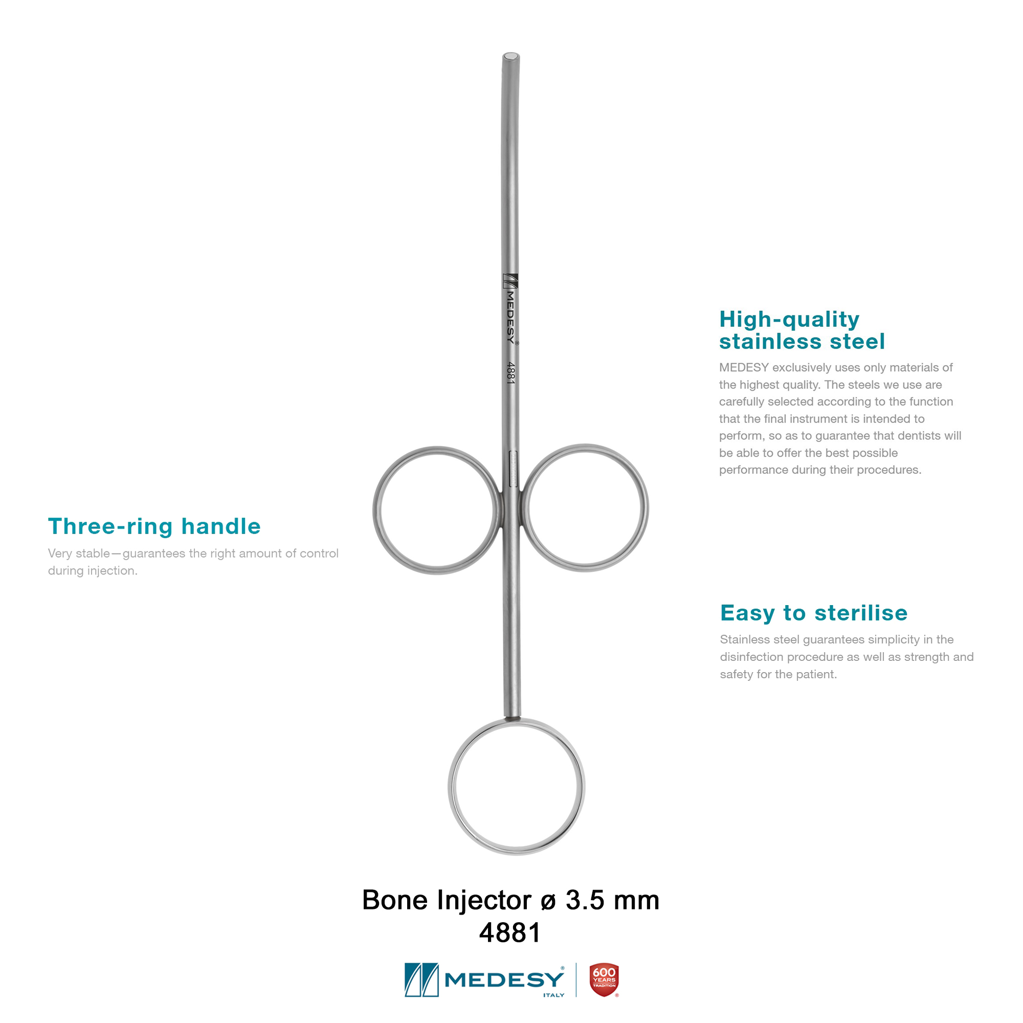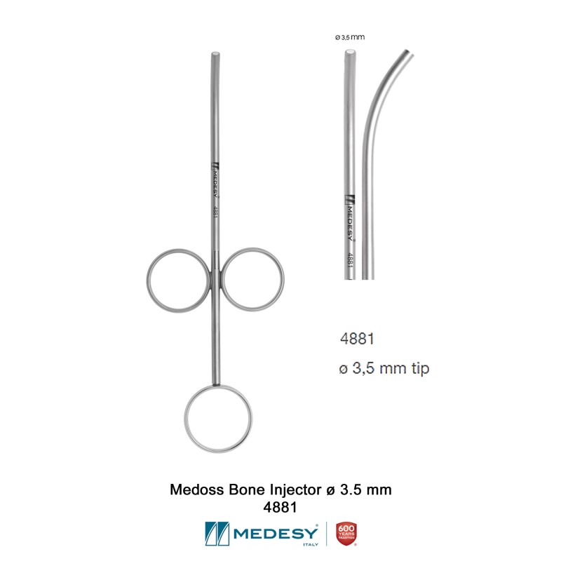 The Medesy Bone Injector ø 3.5 mm 4881 is a stainless-steel bone injector for injecting material scraped from the oral cavity or synthetic bone.
