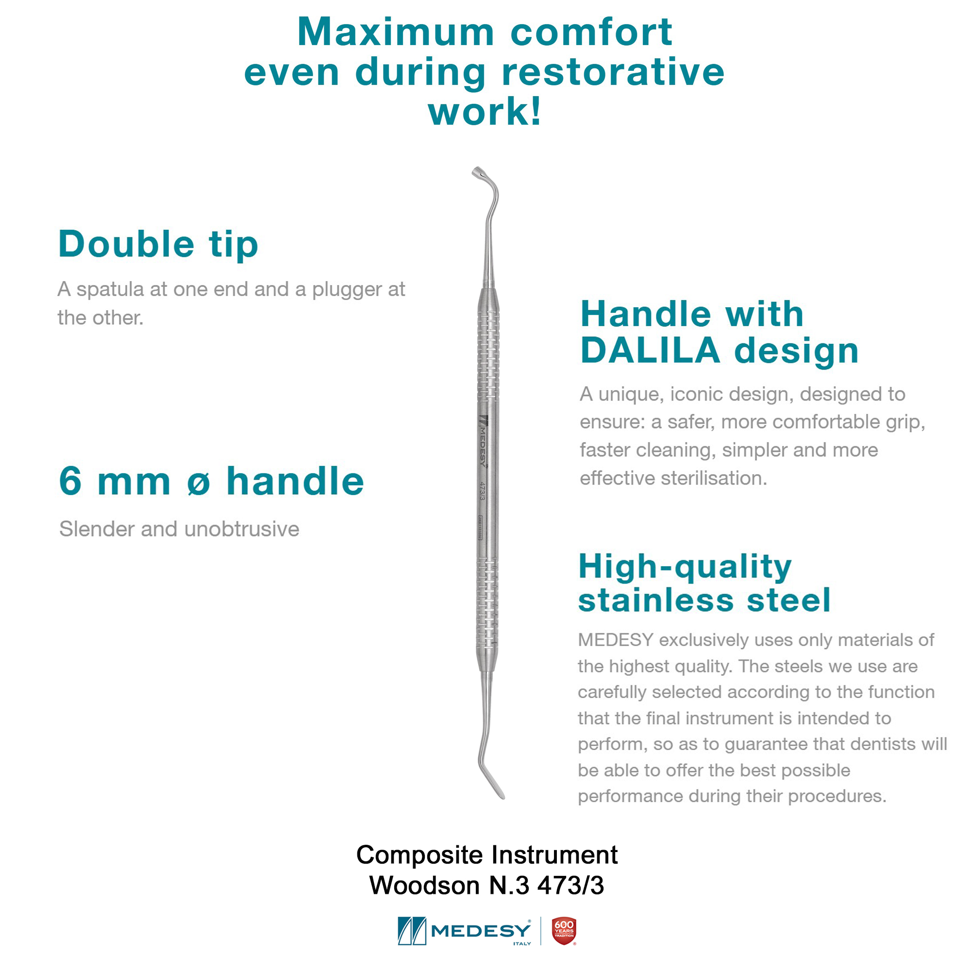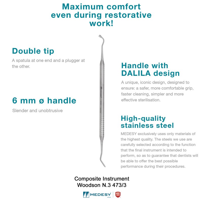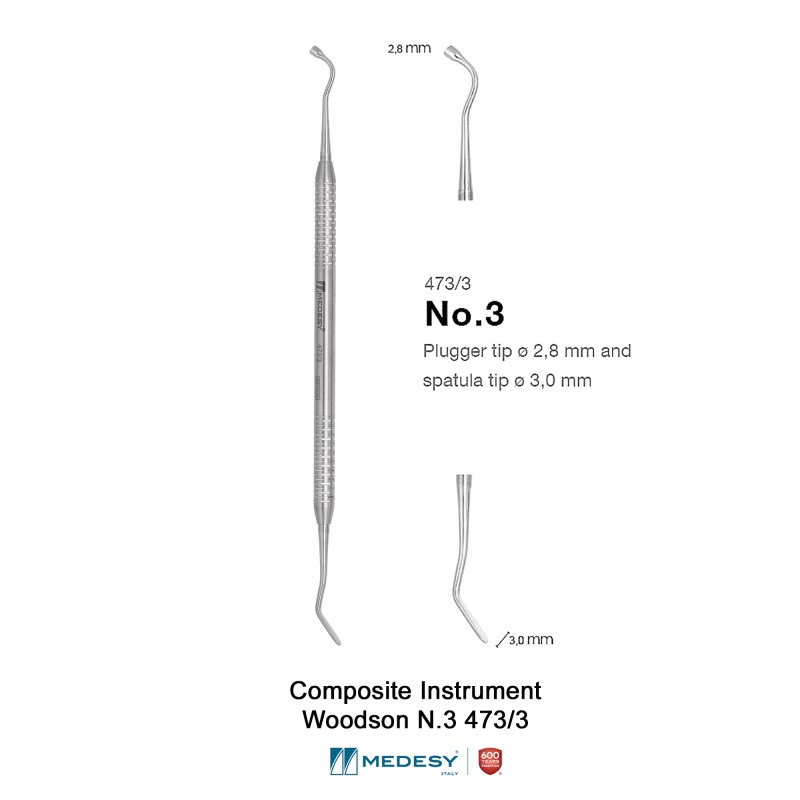 The Medesy Composite Instrument Woodson N.3 473/3 combines a spatula for picking up and placing the material inside the cavity and a plugger for pushing it down and compacting it.