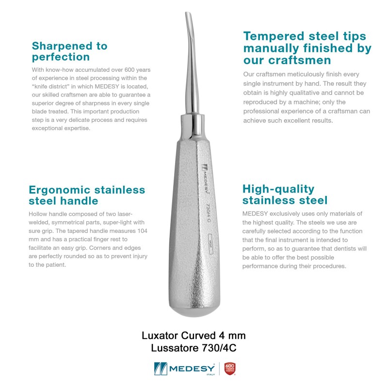 The Medesy Luxator Curved 4 mm Lussatore 730/4C features an exceptionally thin, sharp blade that fits easily into tight apical spaces, offering greater efficiency and precision when cutting the periodontal ligament.