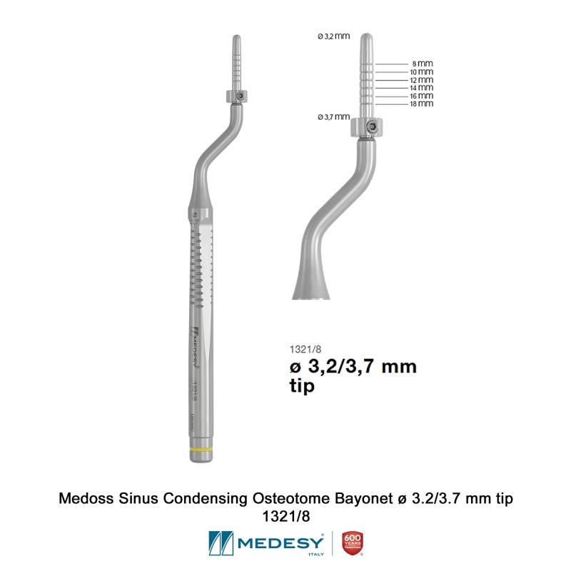A new tip for the osteotomes of the Medoss line:  the terminal portion is now conical to facilitate the insertion in the sinus cavity and has a minimal/maximal diameter scale, progressive depth markings from 8 to 18 mm, by 2 mm steps.