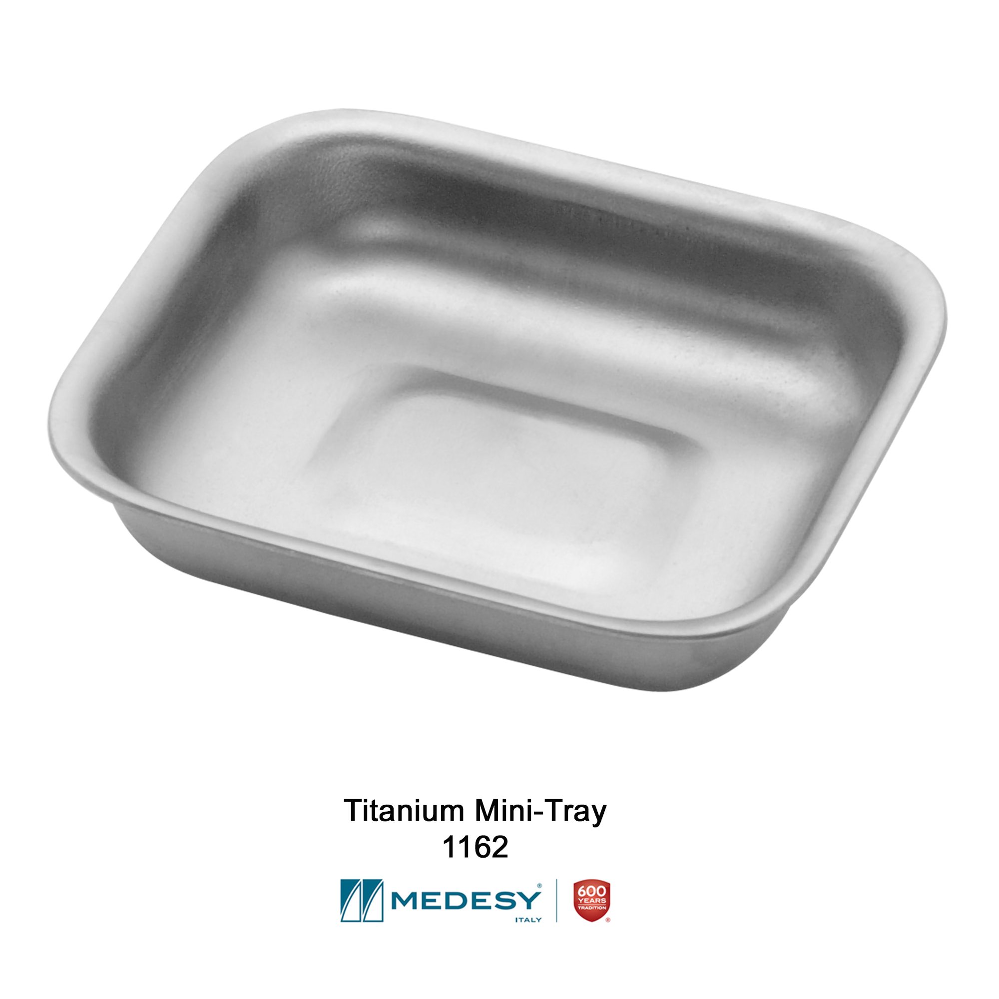 The Medesy Titanium Mini-Tray 1162 is a small bone-collecting tray made of pure titanium: biocompatible material – perfect for use in a surgical environment. Light and compact, measuring 60 x 50 x 15 mm.